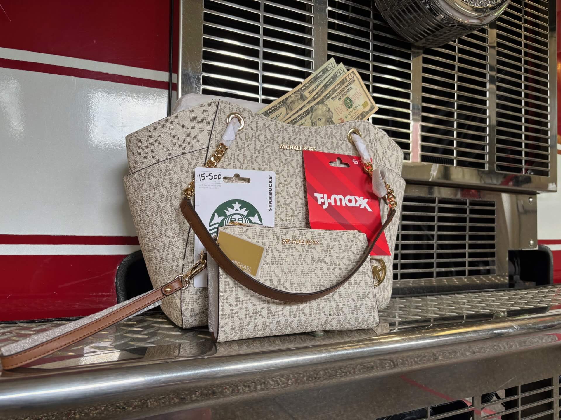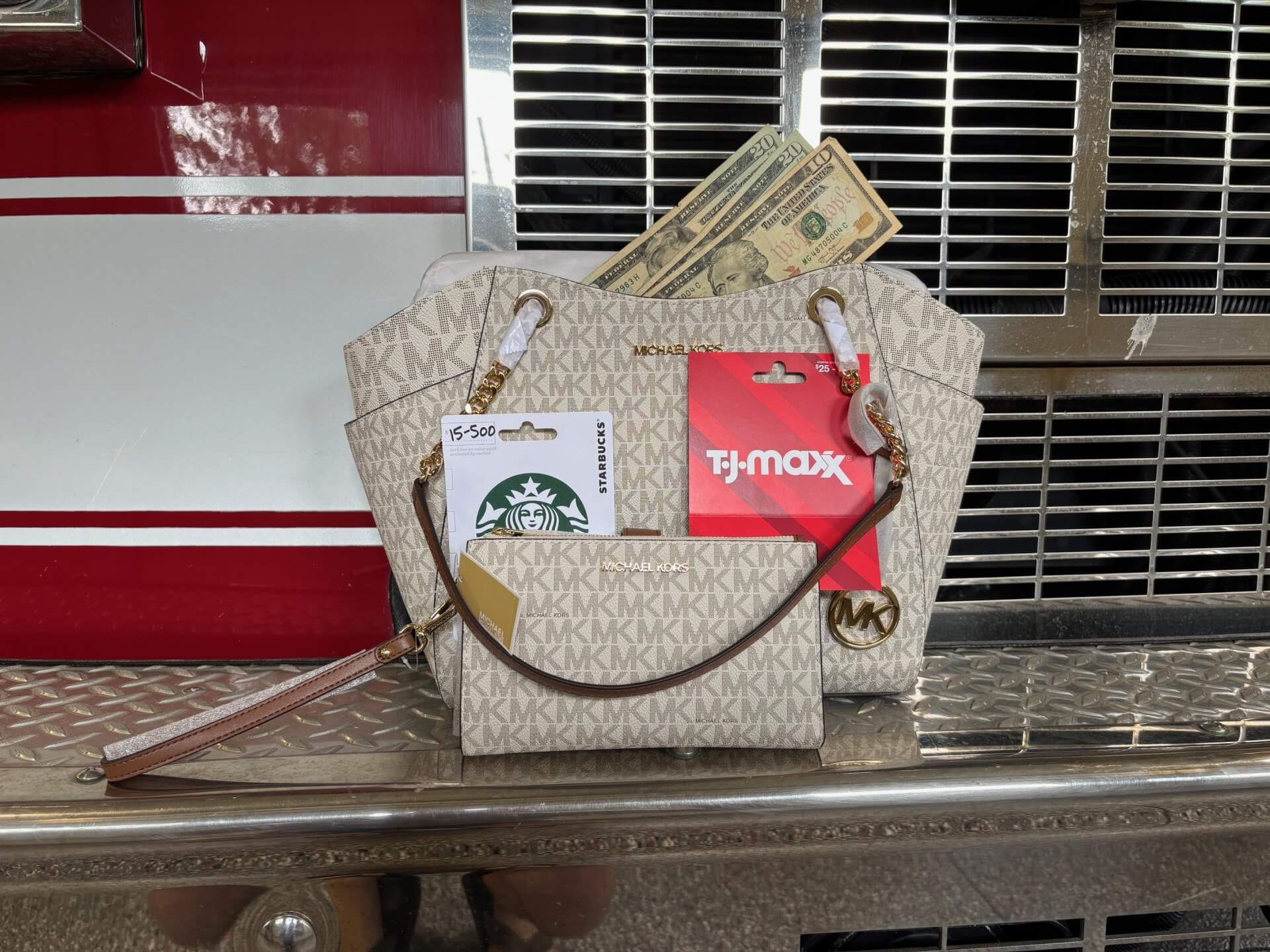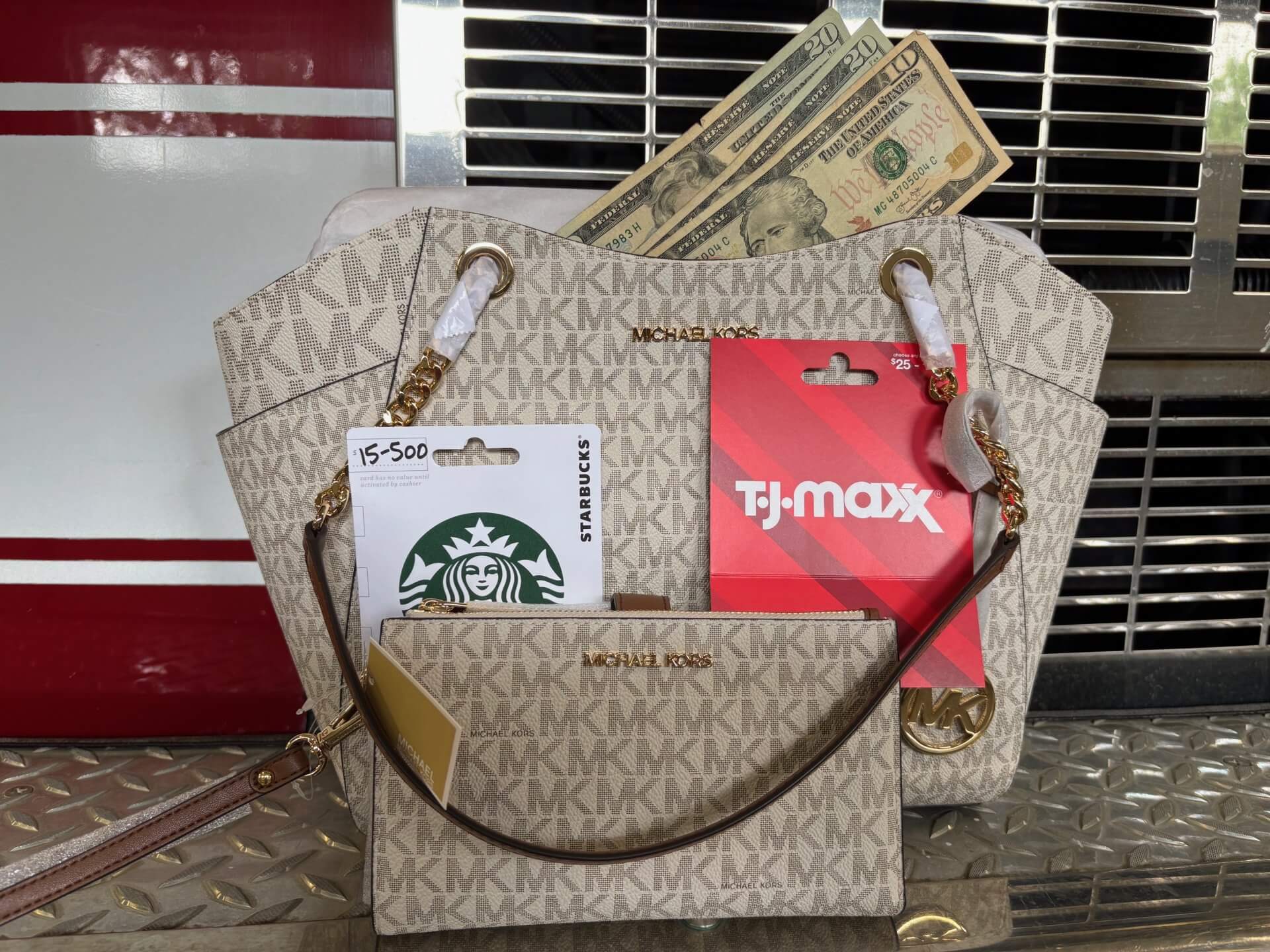 - 1 – Michael Kors Jet Set bundle (large shoulder bag + double zip wristlet) both in signature vanilla