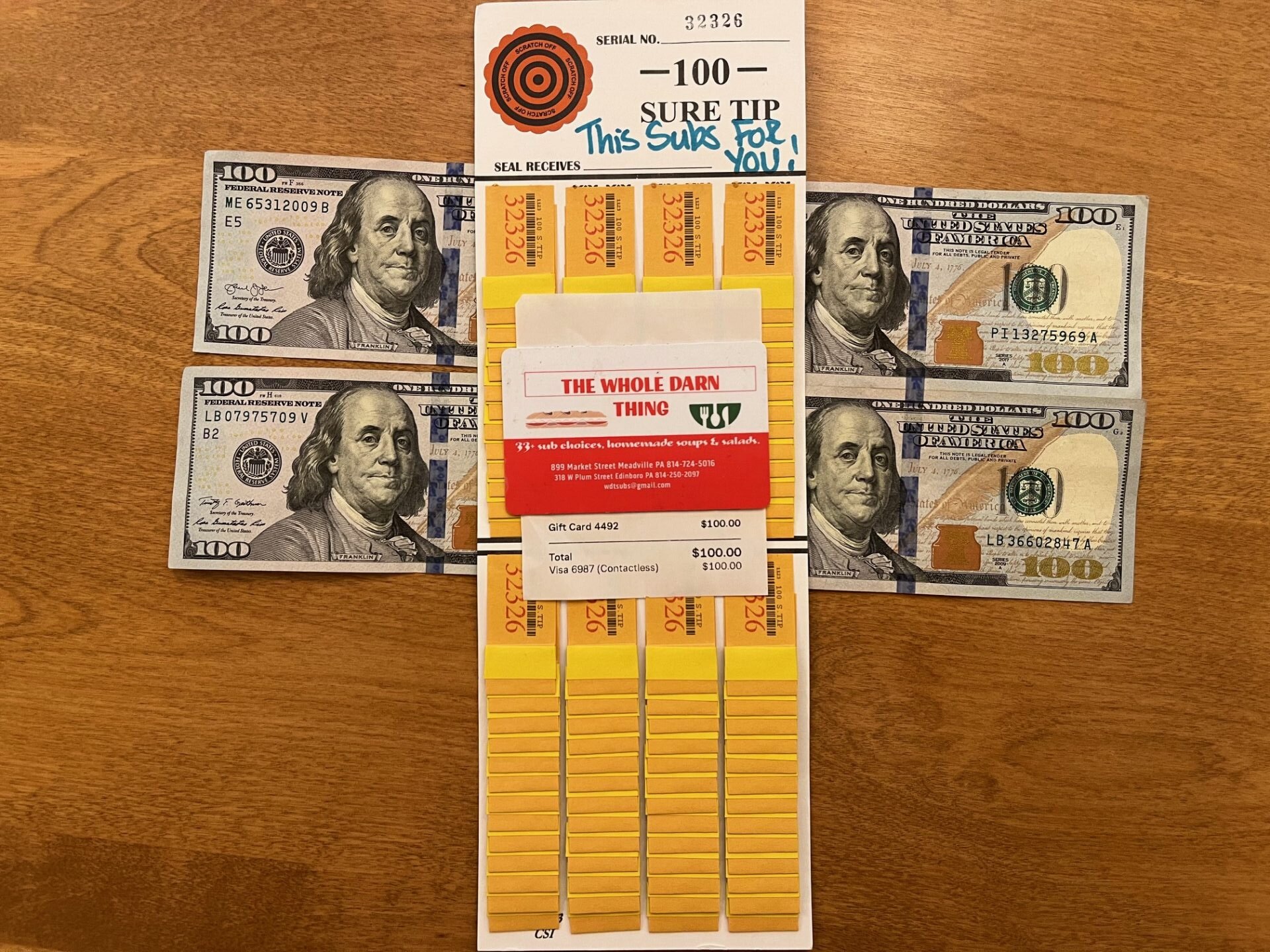 Summer time is the perfect time for grab and go meals. When it comes to grab and go, The Whole Darn thing has subs covered. This package includes a $100.00 gift card to The Whole Darn Thing and $400.00 cash to help fund your summer adventure. Thank you for supporting our fire company! Big things are coming to West Mead Township and it wouldn’t be possible without you.